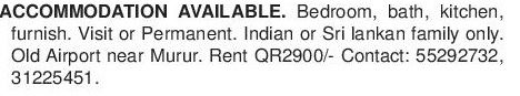 Accommodation Available For Indian Or Sri Lankan Family Only. Copyright The Daily The Gulf Times Newspaper Qatar.
