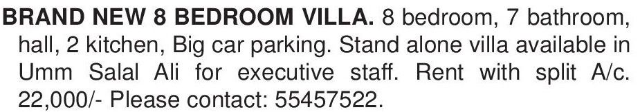 Brand New 8 Bedroom Villas For Rent In Umm Salal Ali For Executive Staff. Please Contact 55457522. Copyright The Daily The Gulf Times Newspaper Qatar.