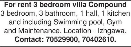 For Rent 3 Bedroom, 3 Bathroom, 1 Hallm 1 Kitchen including Swimming Pool, Gym and Maintenance Villa Compound in Izhgawa Contact 70529900, 70402610 15-08-2015. Copyright The Daily The Gulf Times Newspaper Qatar.