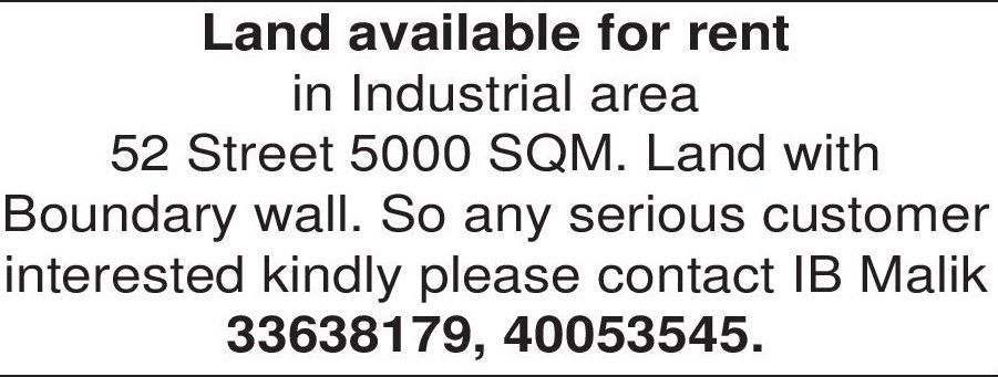 Land Available For Rent In Qatar In Industrial Area 52 Street 5000 SQM. Land With Boundary Wall. Contact IB Malik 33638179, 40053545. 13-08-2015. Copyright The Daily The Gulf Times Newspaper Qatar