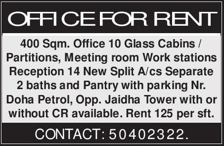 Office For Rent 400 Sqm. Near Doha Petrol Opposite Jaidha Tower Rent 125 Per Square feet. Contact: 50402322. Copyright The Daily The Gulf Times Newspaper Qatar.