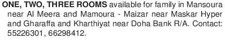 One Two Three Rooms Available For Family In Mansoura 05-08-15. Near Al Meera and Mamoura - Maizar Near Maskar Hyper and Gharaffa and Kharthiyat near Doha Bank R/A. Contact 55226301, 66298412.