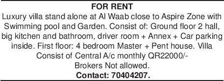 Stand Alone Luxury Villa For Rent In Al Waab 09-08-15 Close to Aspire Zone With Swimming Pool and Garden. Consist of Ground Floor 2 Hall Big Kitchen Etc. Contact: 70404207. Copyright The Daily The Gulf Times Newspaper Qatar.